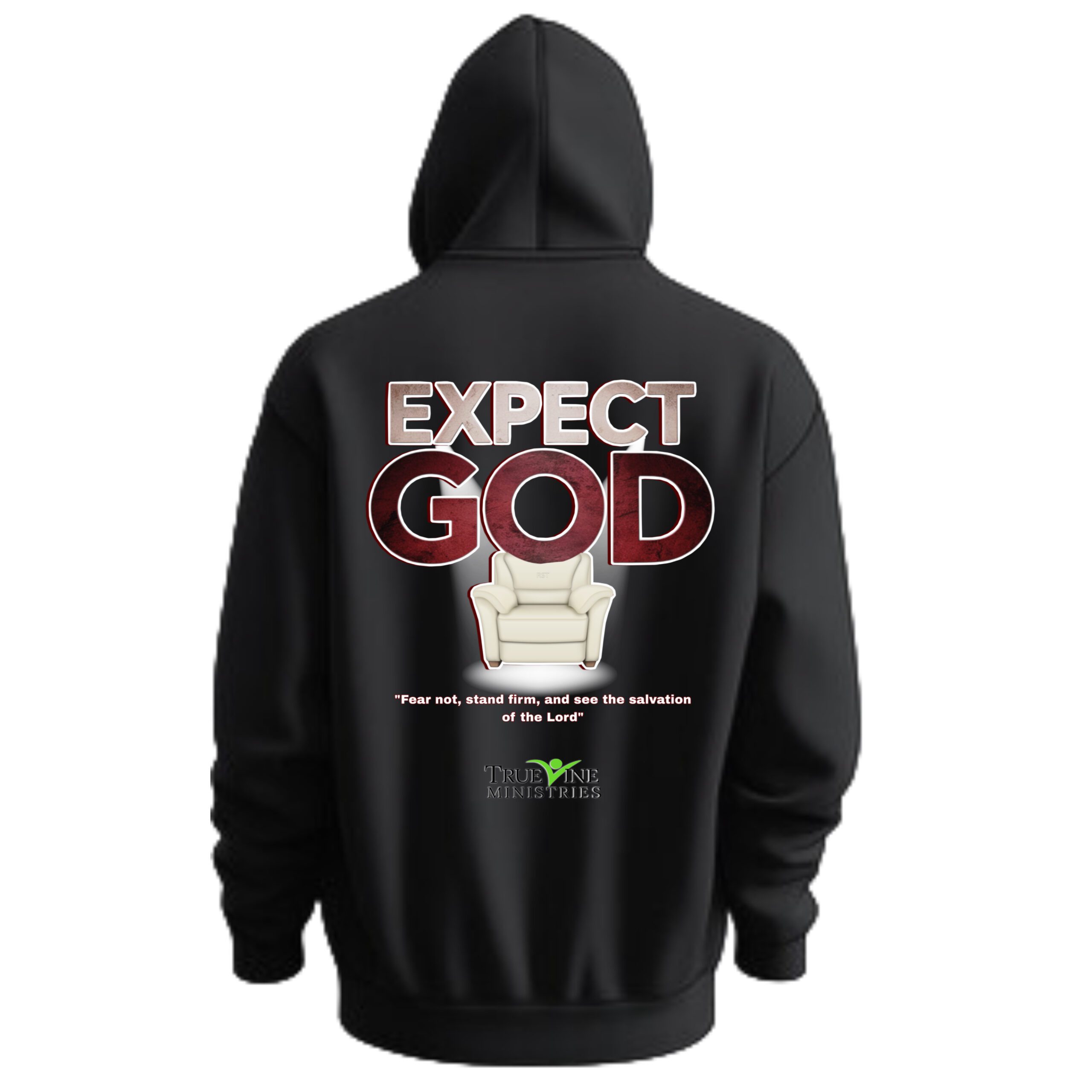 “Stand Firm (front) Expect God (back) ” printed in beige & burgundy, and green on a hunter black adult unisex midweight hooded sweatshirt.