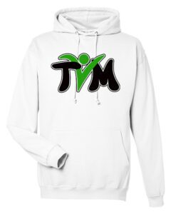 “TVM” printed in black & lime green on the front of a white adult unisex midweight college hooded sweatshirt.